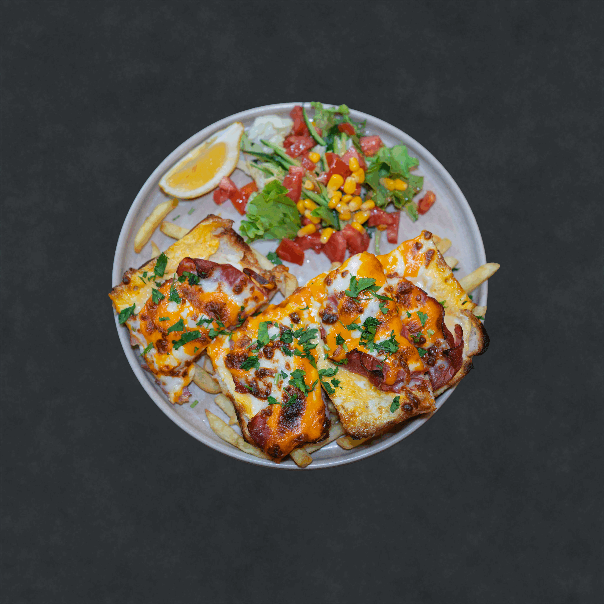 Taze Çırpılmış Yumurta, Füme Kaburga, Cheddar Sos, Patates Kızartması, Yeşillik Ve Soslar Eşliğide