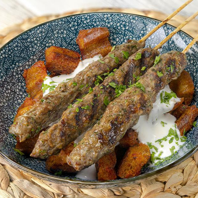 Beğendi Sos, Tortilla Lavaş, Şiş köfte, Patates kızartması, Akdeniz yeşillikleri