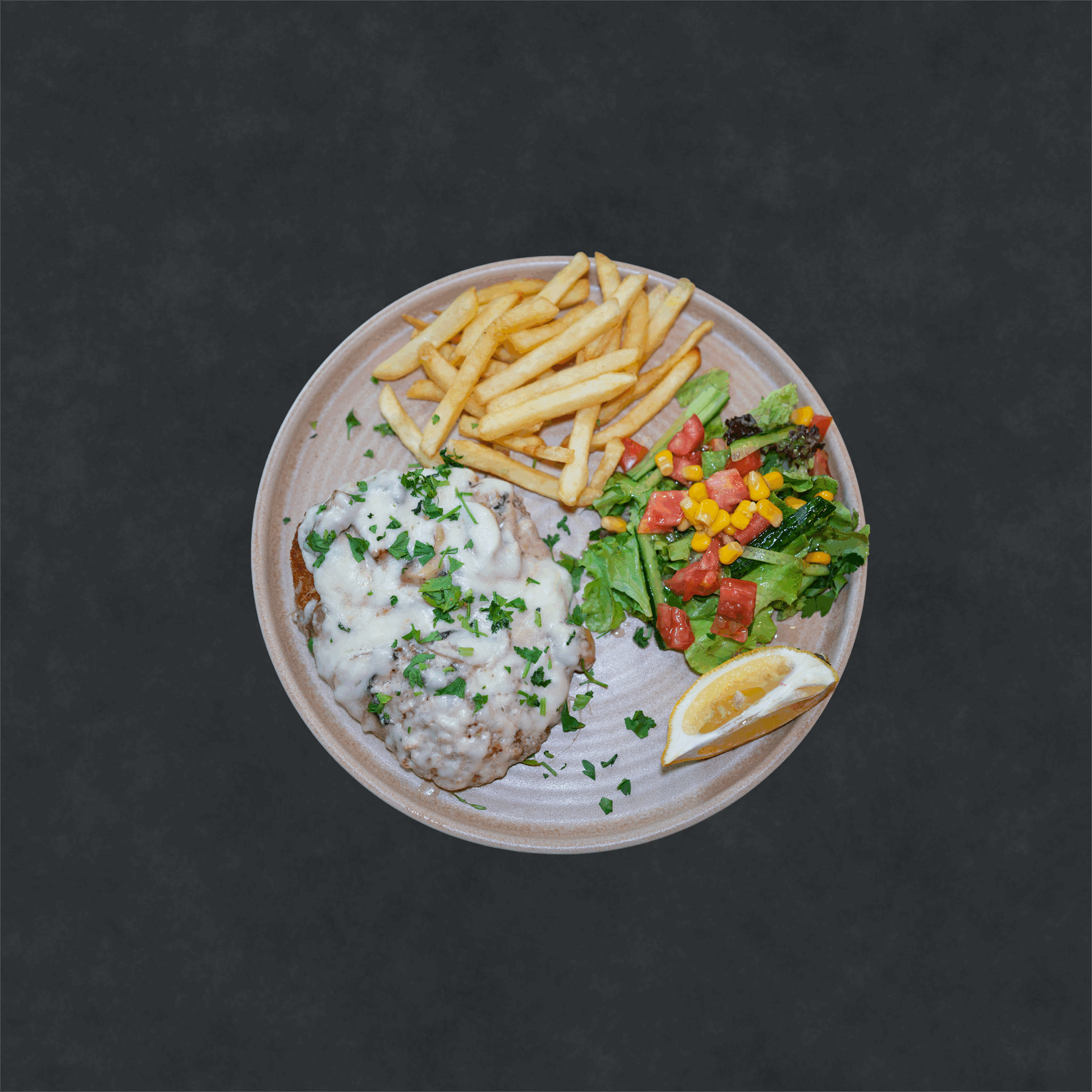200gr Panelenmiş Tavuk, Mantar Sos, Eritilmiş Peynir, Patates Kızartması, Akdeniz Yeşillikleri